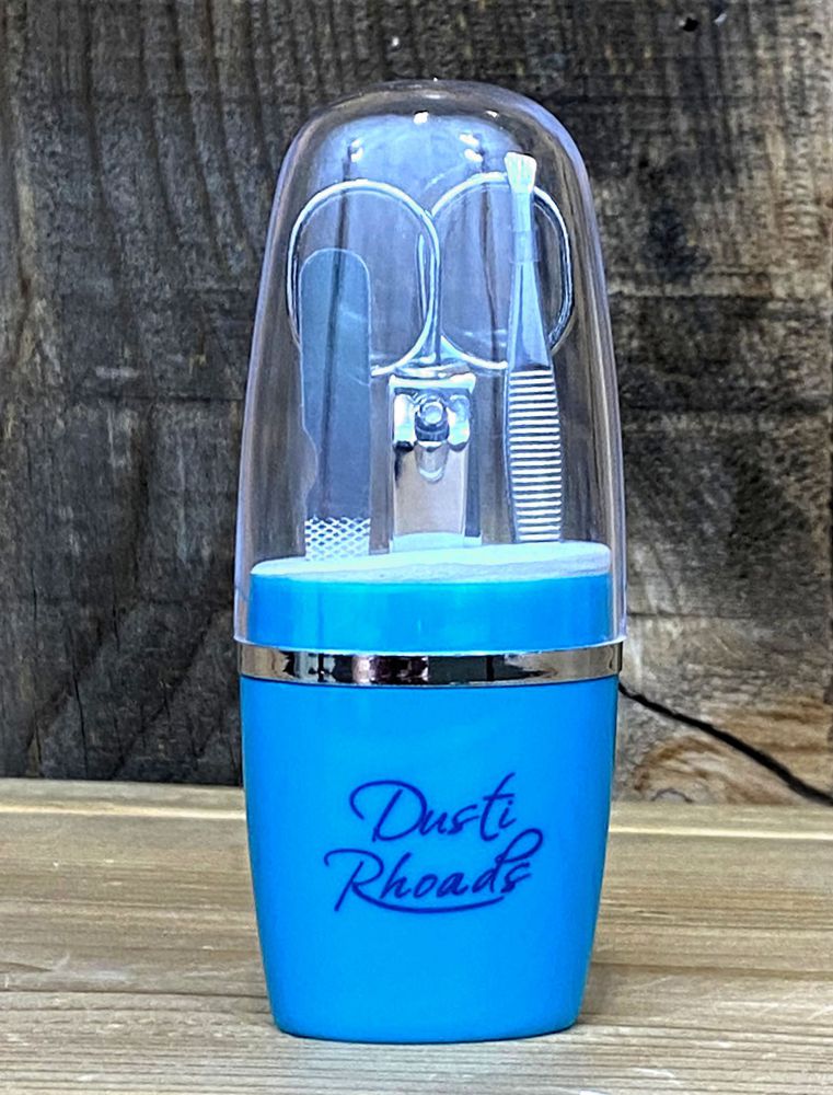 This turquoise plastic manicure set features the Dusti Rhoads logo in purple on the front. On the inside you will find 4 metal tools that help with the nail prep and application process including a set of nail clippers, a pair of cuticle scissors, a metal nail file, and a pair of tweezers. You will receive 5 of these manicure sets.
