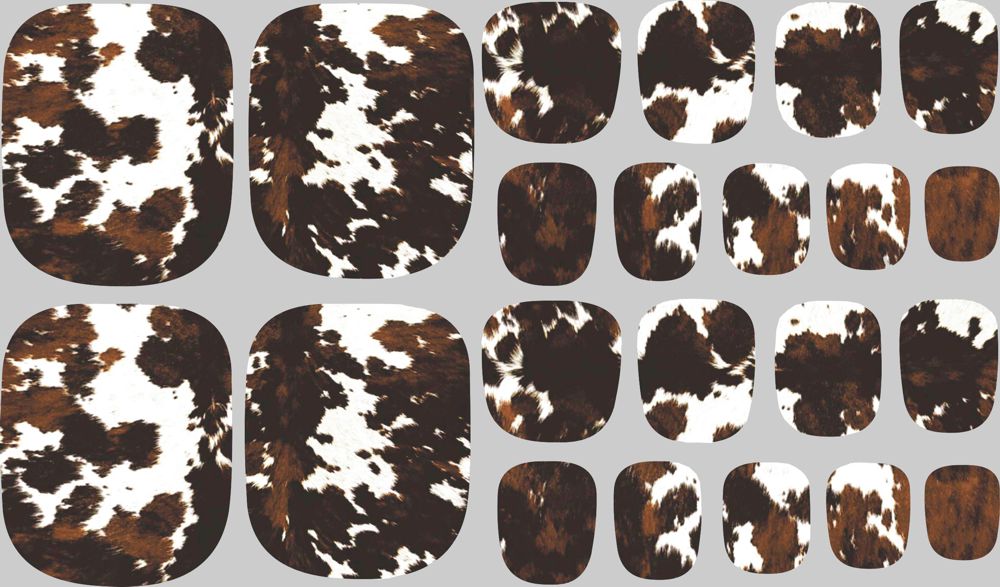 The Cattle Drive real polish pedicure set features a black, white and brown cowhide design. Each set comes with 22 strips in 11 different sizes for the perfect fit every time!