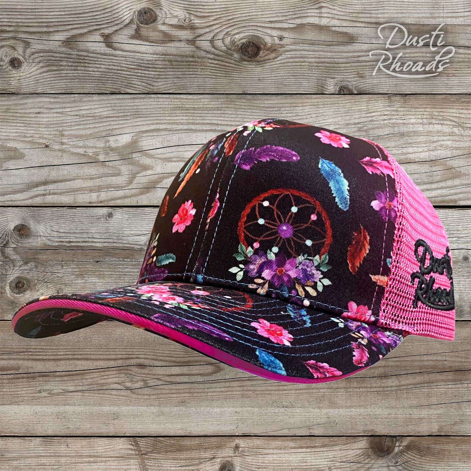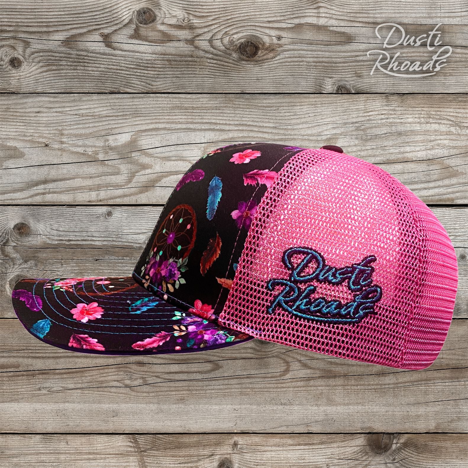 This Dream On ladies fit cap features a black background with pink, purple, turquoise and brown dream catchers and feathers on the front. The back features pink mesh, a black snap, and black elastic pony tail back. There is a Dusti Rhoads logo on the left side of the cap embroidered in black.