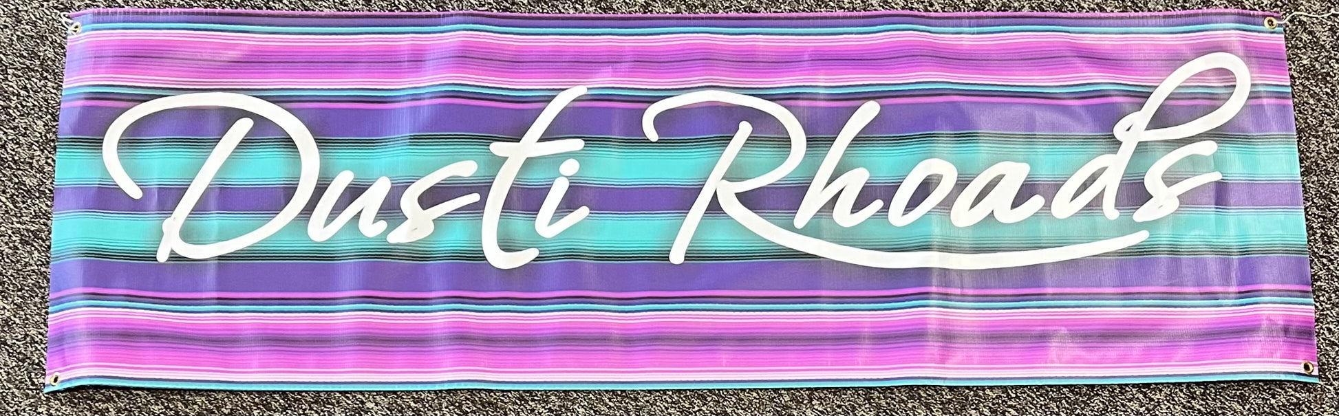 6' x 2' vinyl banner with metal gromets. Features our purple/turquoise/pink serape stripe background with a white Dusti Rhoads logo across the center.