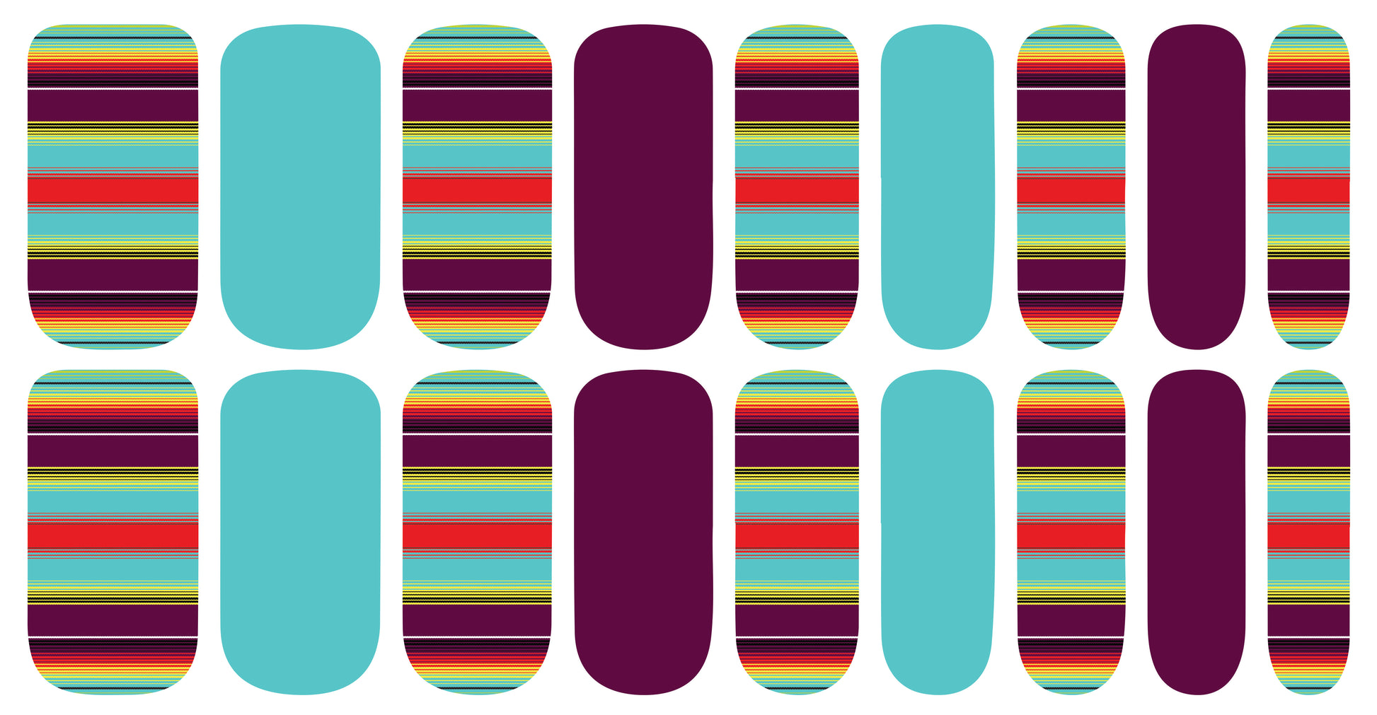 Morado Serape 18-piece real nail polish strips. These nails feature solid navy purple & turquoise strips alternating with purple, turquoise, lime green & coral serape strips.