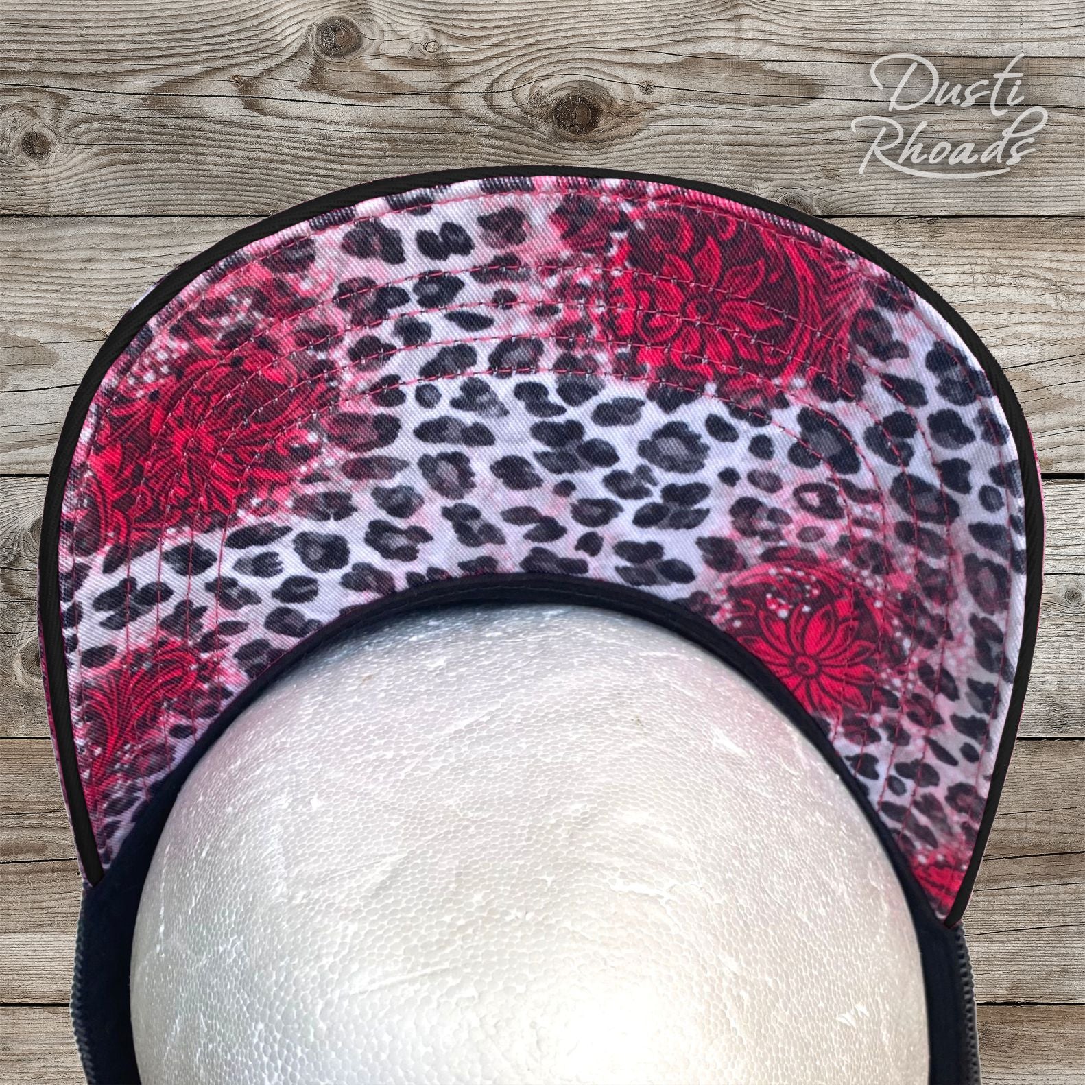 This Ranch Gypsy ladies fit hat features our snow leopard print & pink floral tooled leather pattern throughout the bill and front panels with a grey leather patch on the front with the Dusti Rhoads logo. It has a grey mesh back with a snapback and is a pony tail cap!