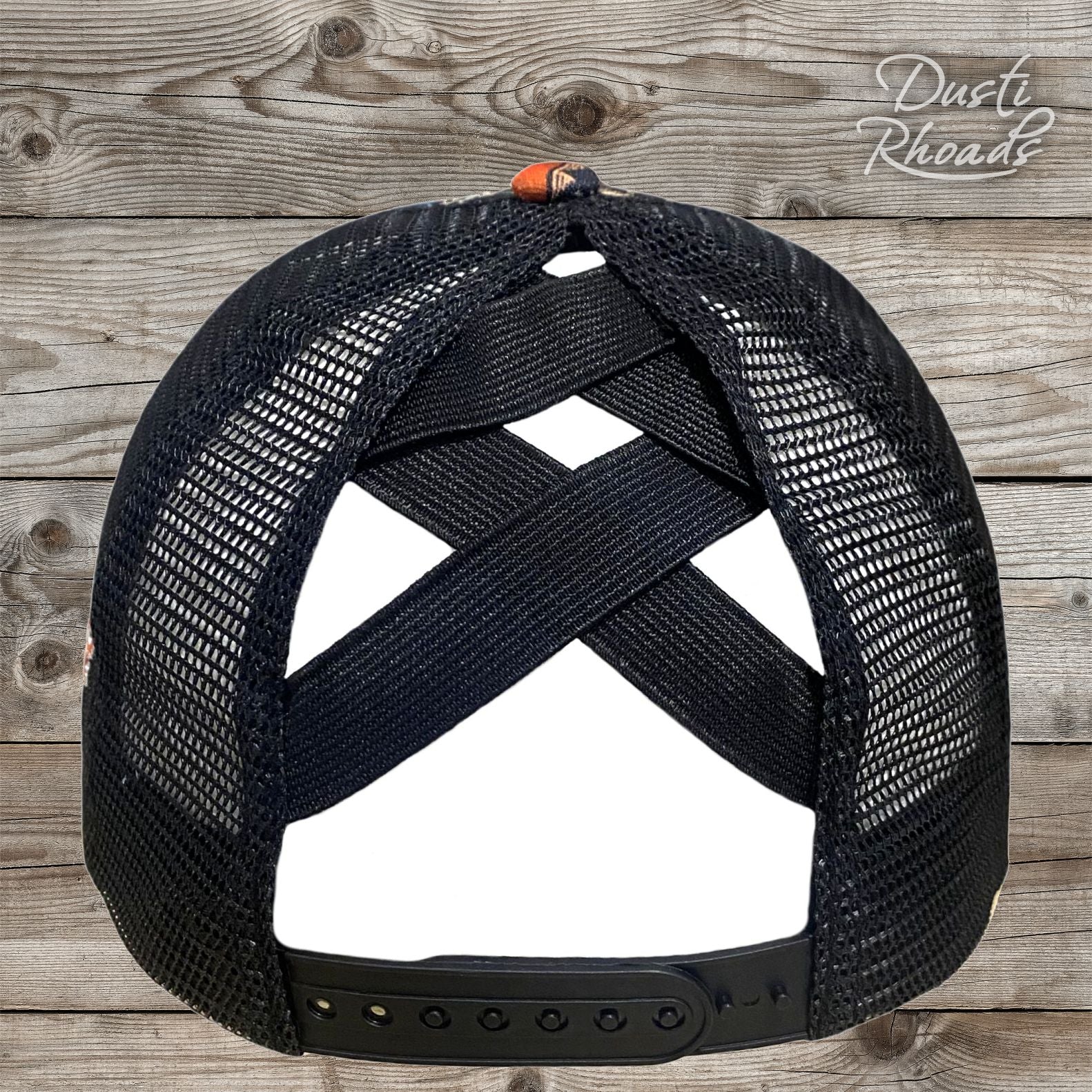 This Wild As You women’s fit 6 panel hat features a burnt orange background with cowhide, turquoise cacti, Aztec symbols and desert scenes on the front. The back features black mesh, black pony tail elastic and a black snap. There is a Dusti Rhoads logo on the left side of the cap embroidered in burnt orange.
